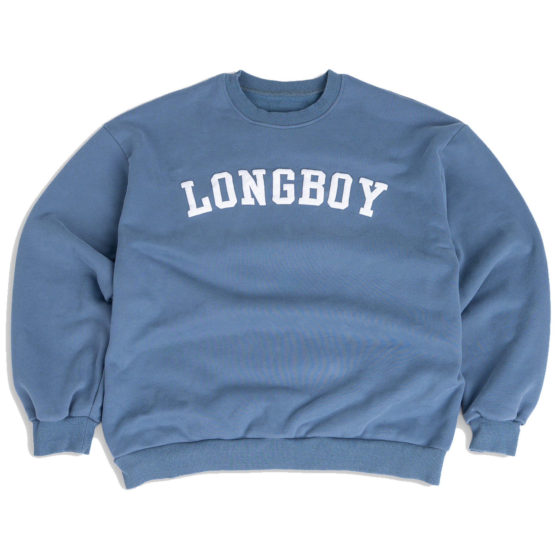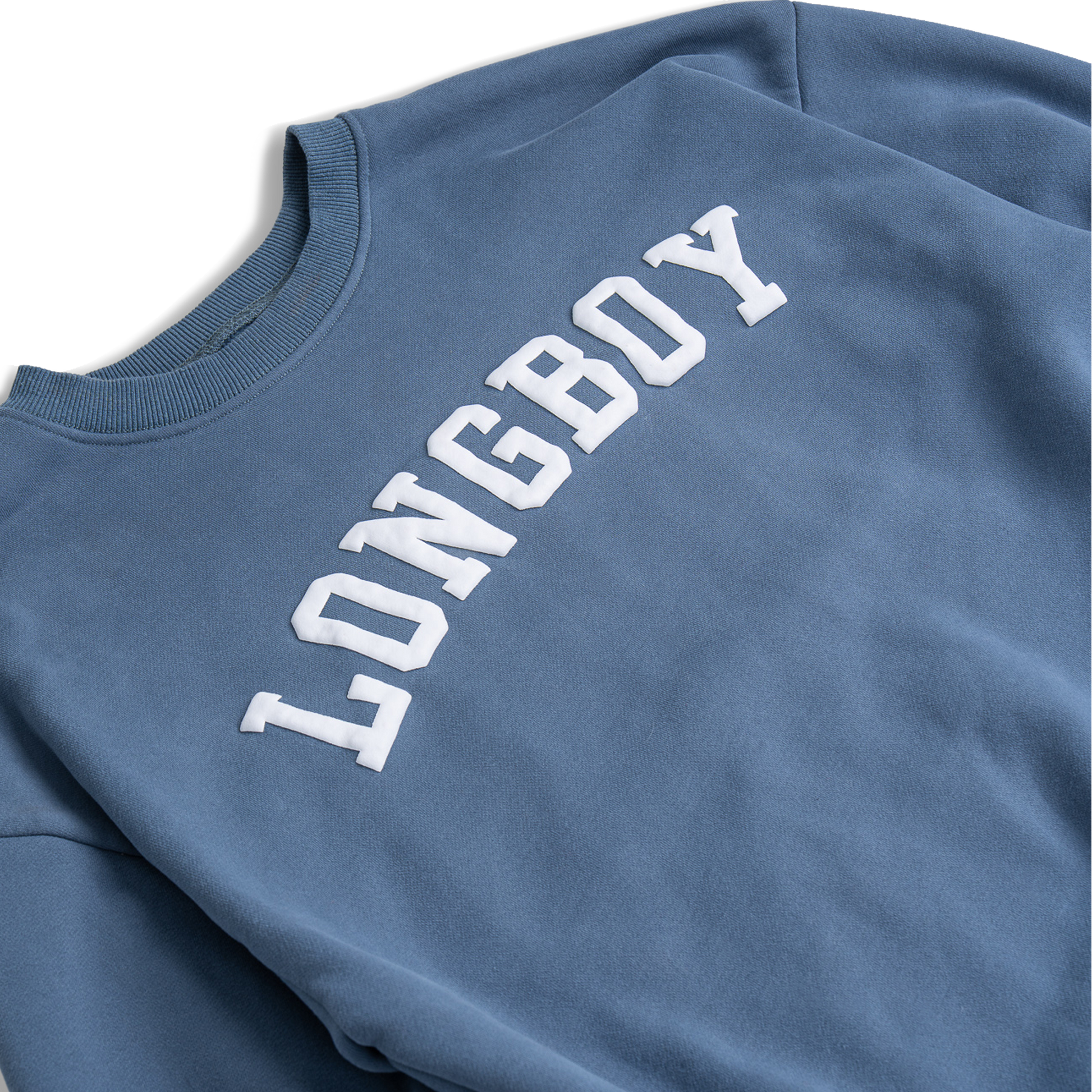 The crisp white varsity lettering stands out against a rich washed blue backdrop, giving it a nostalgic, lived-in look that feels both playful and classic.